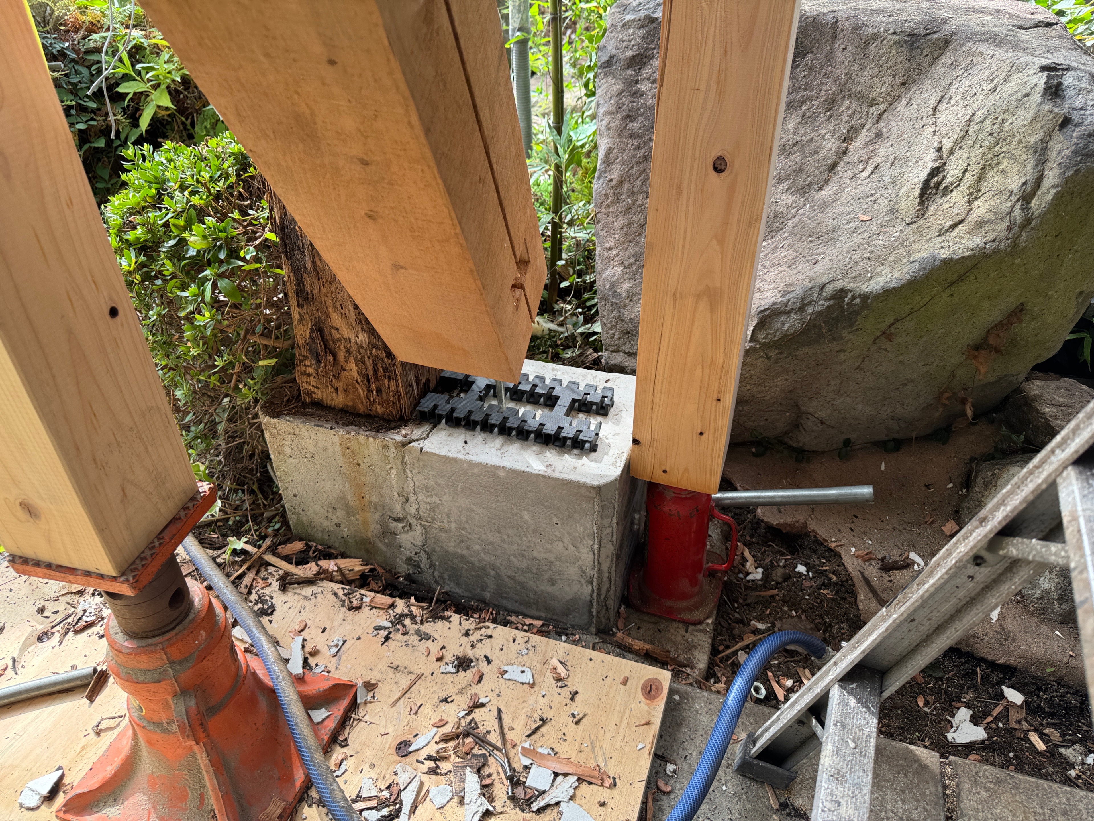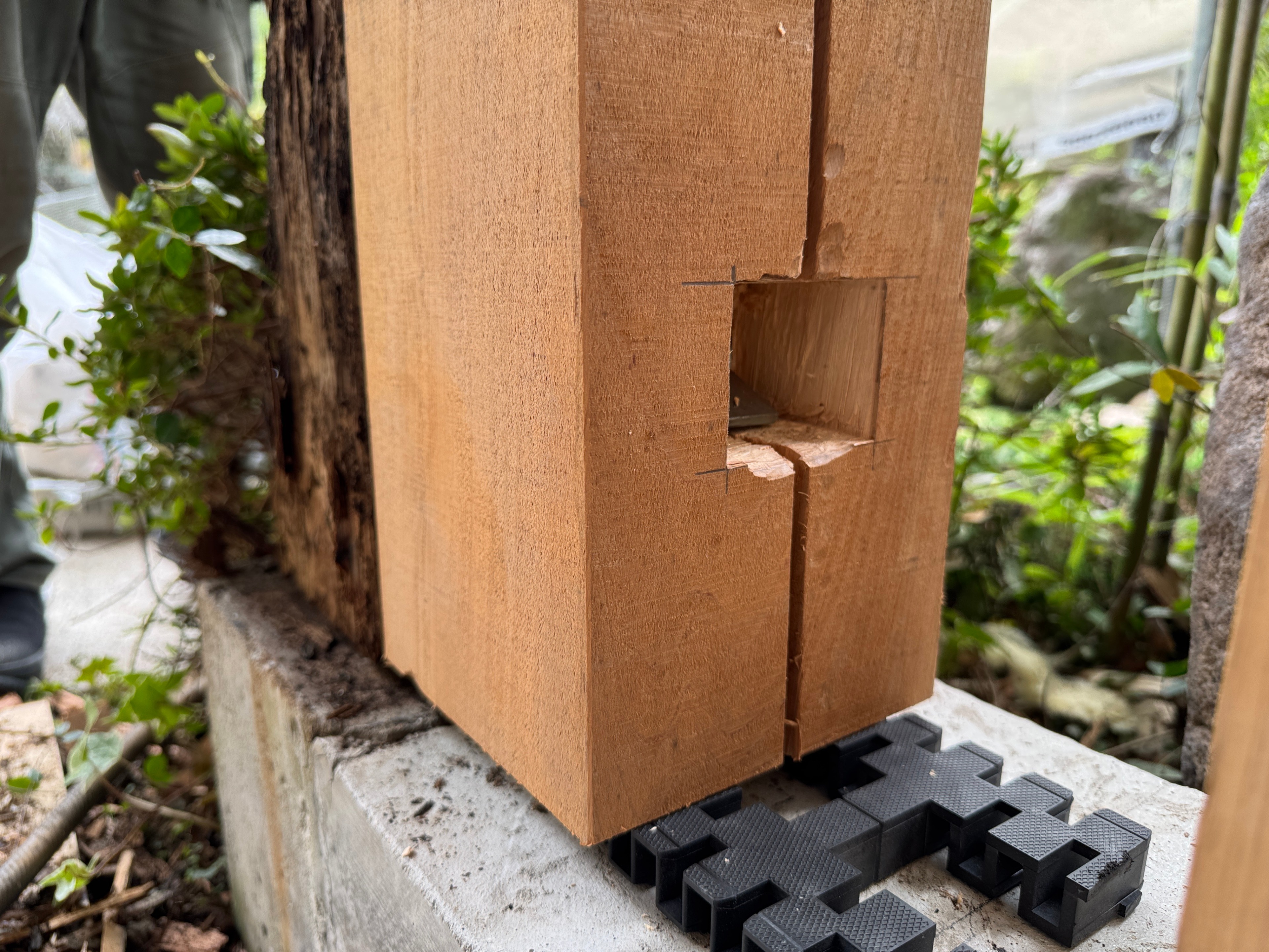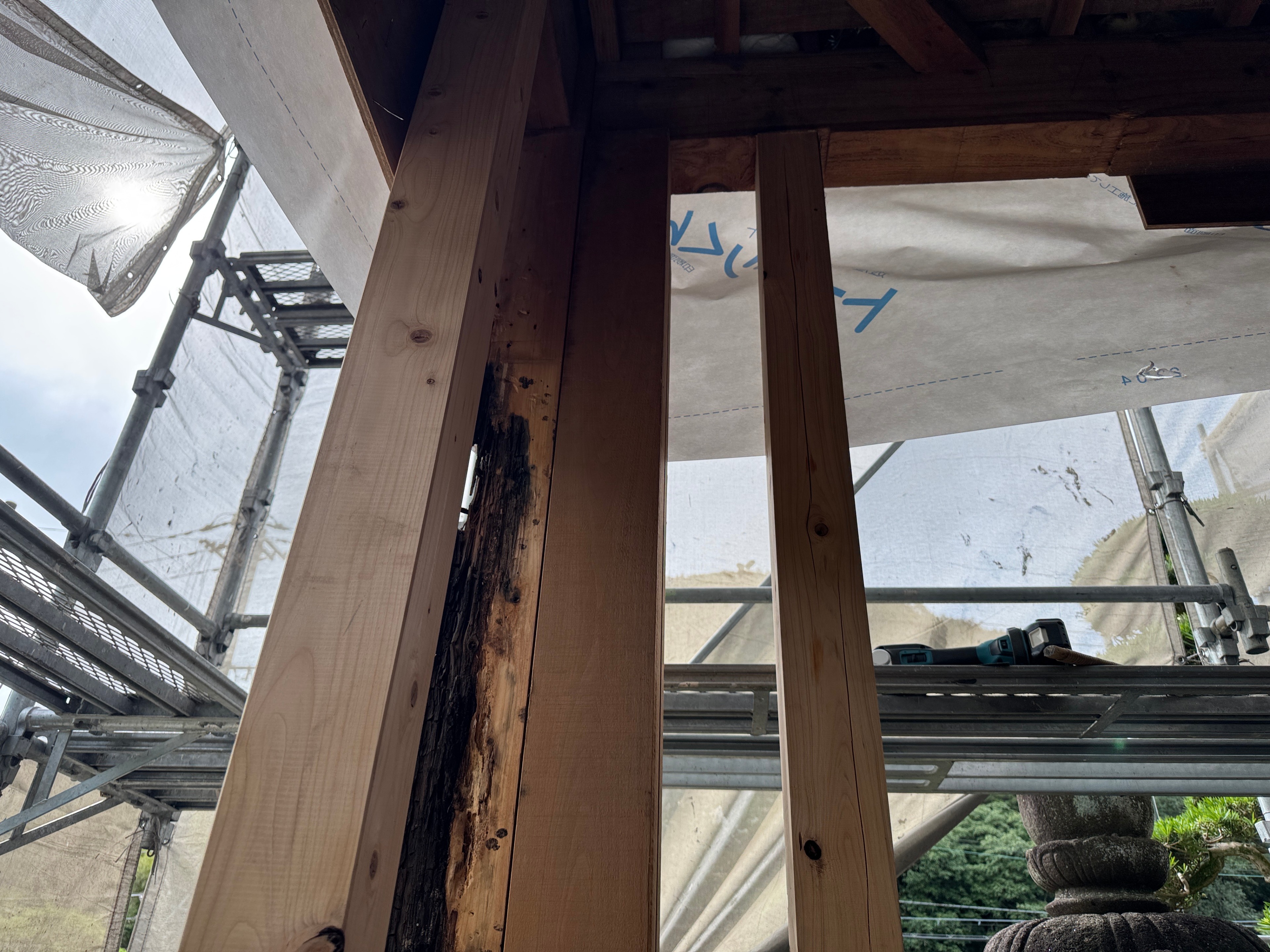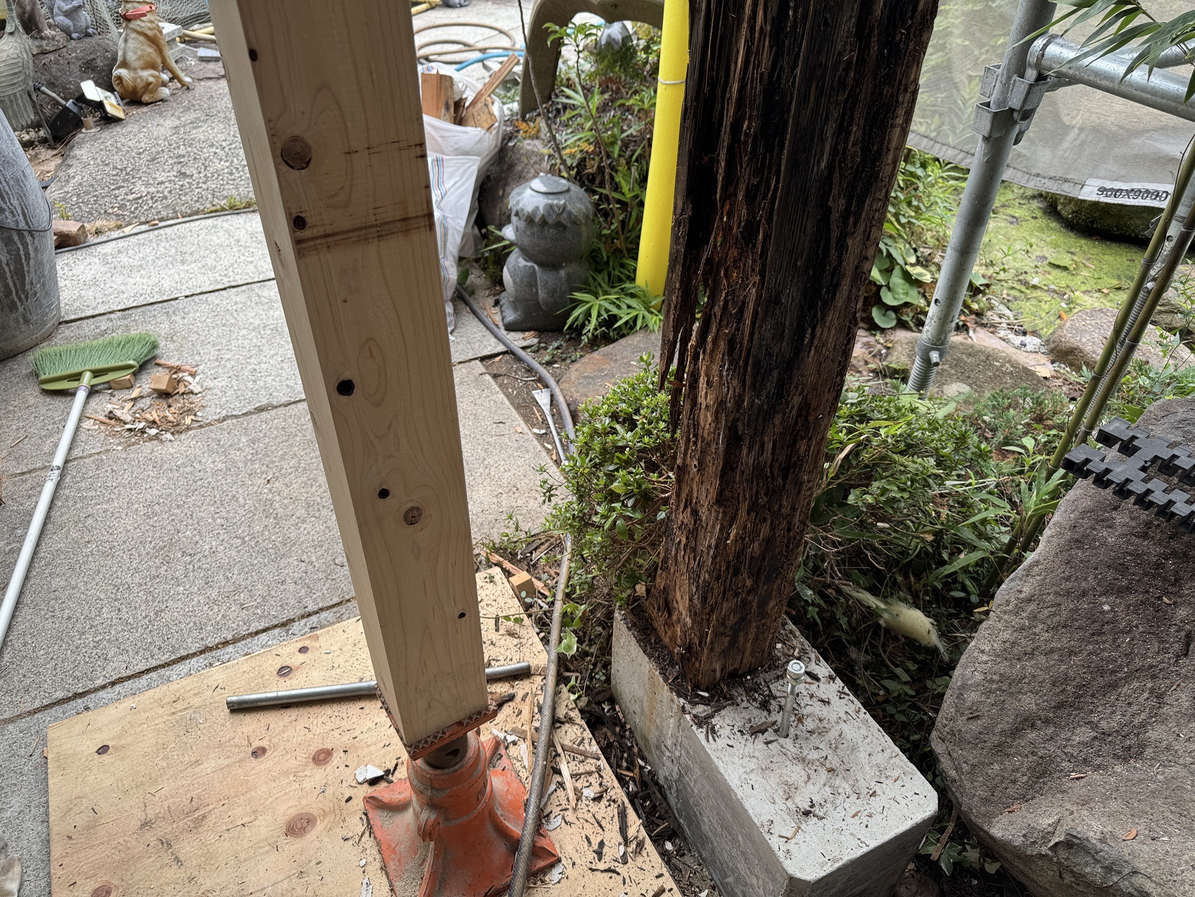 先ずは補助の新たな柱を取付をしていき、その後傷んだ柱を