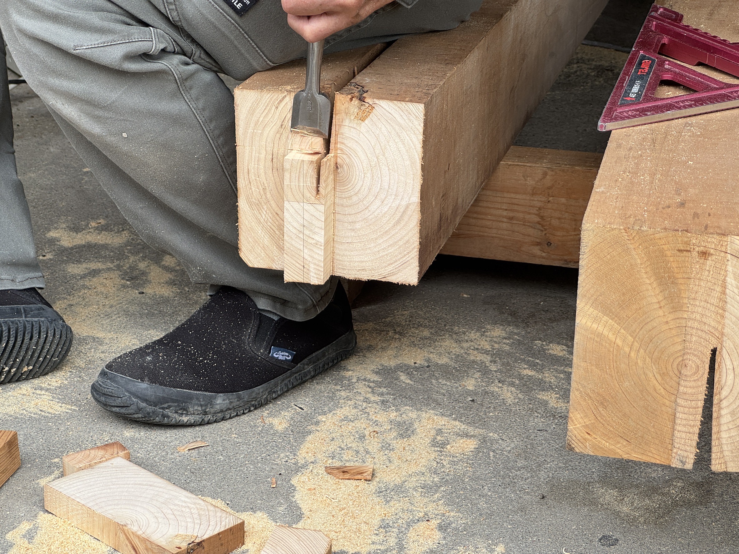 在来の柱の横に取付する為、梁にボルトとホゾ組準備しています