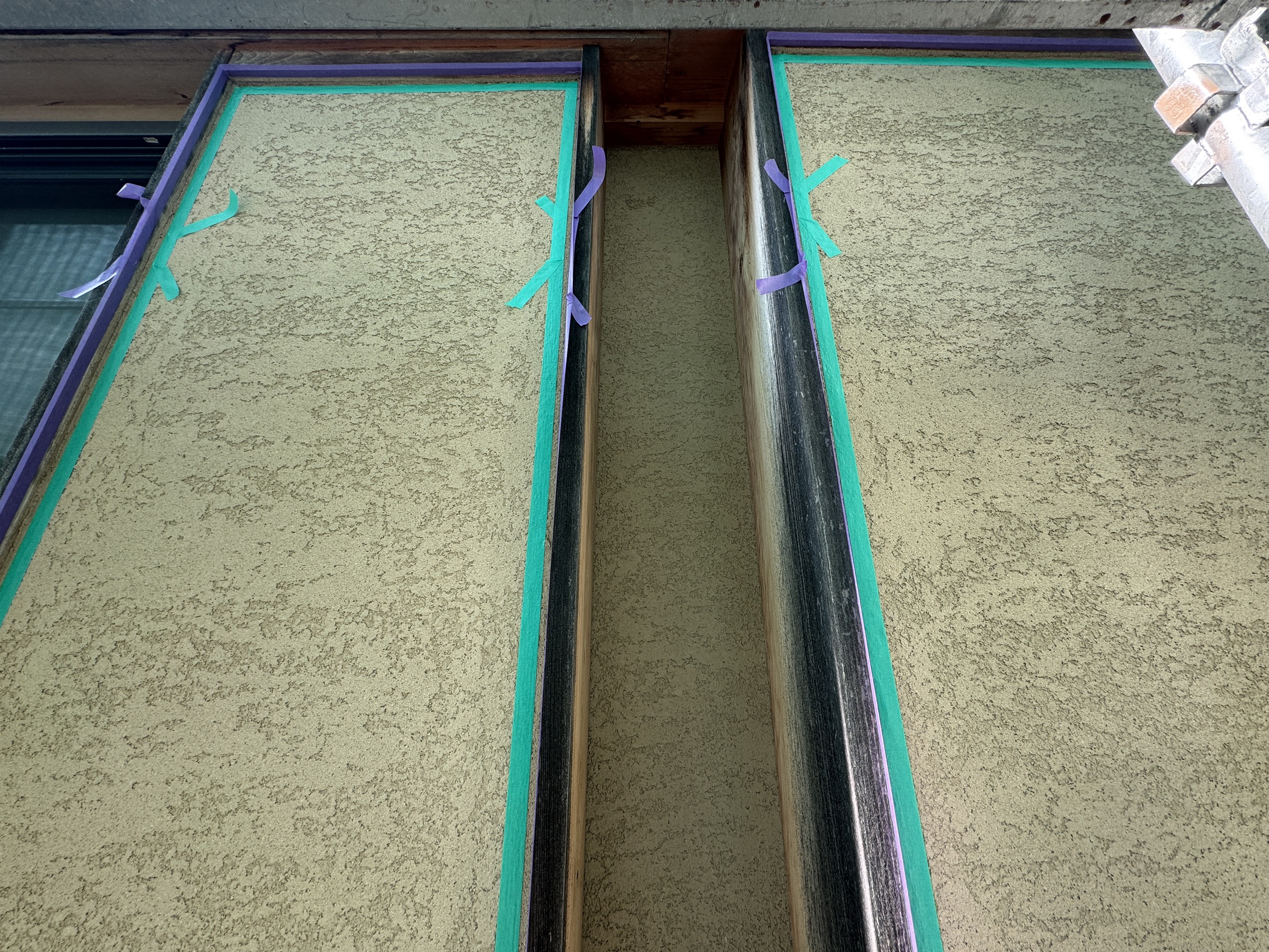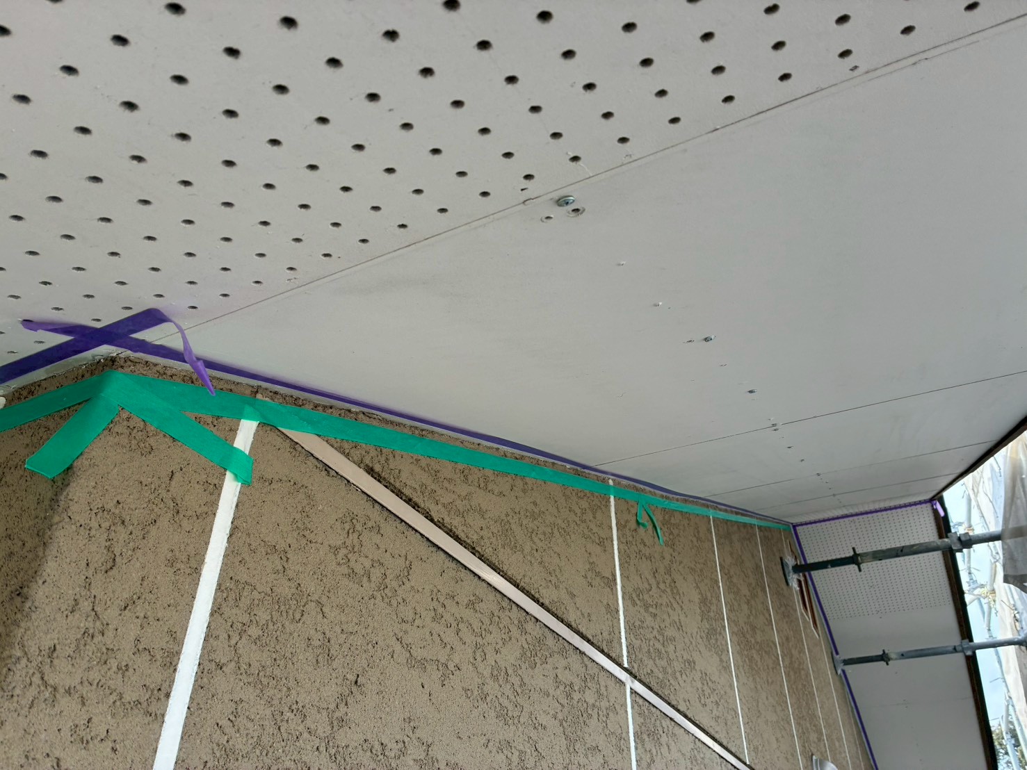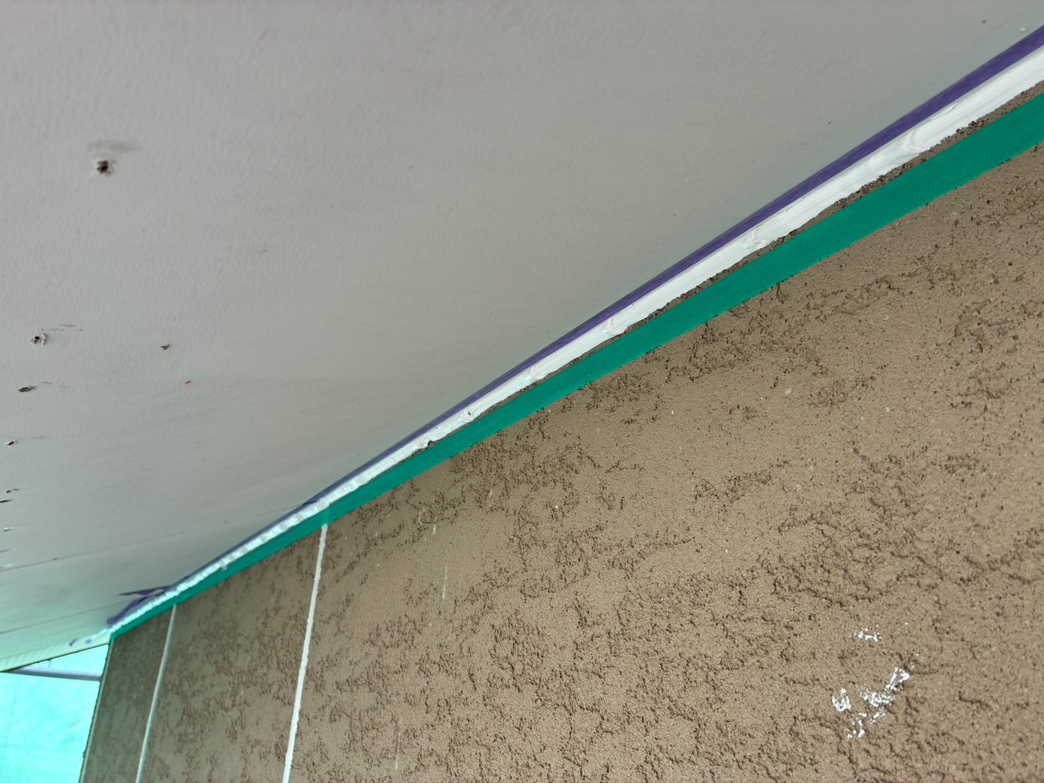 軒天井と外壁の入り隅にコーキングを増し打ちしています