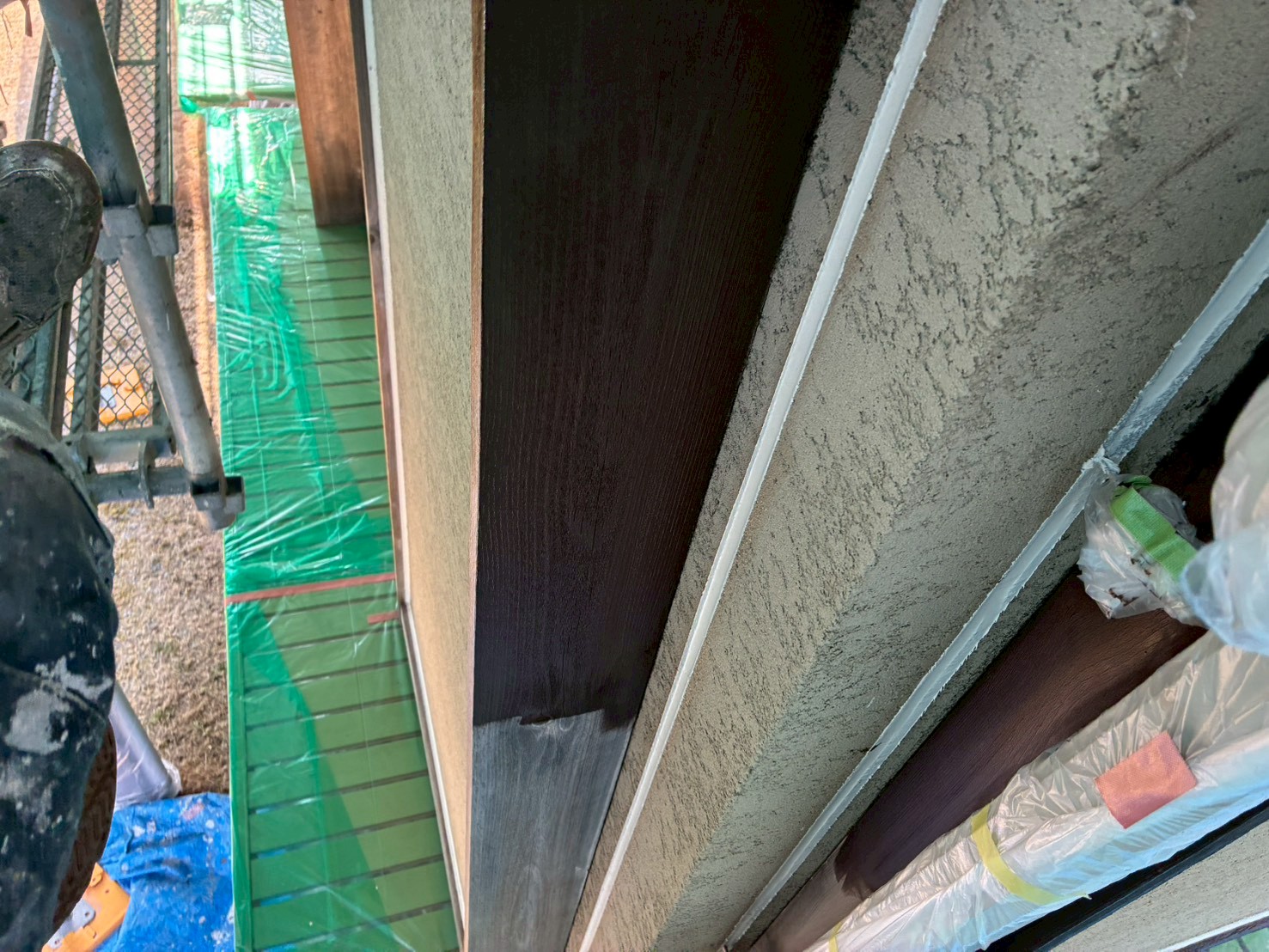 軒天の塗装と並行し木部の防木塗装の1回目施工していきます
