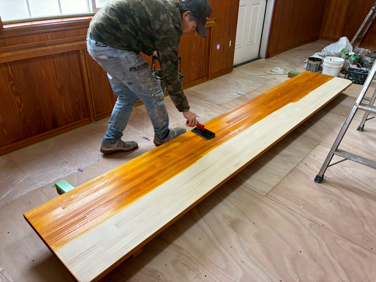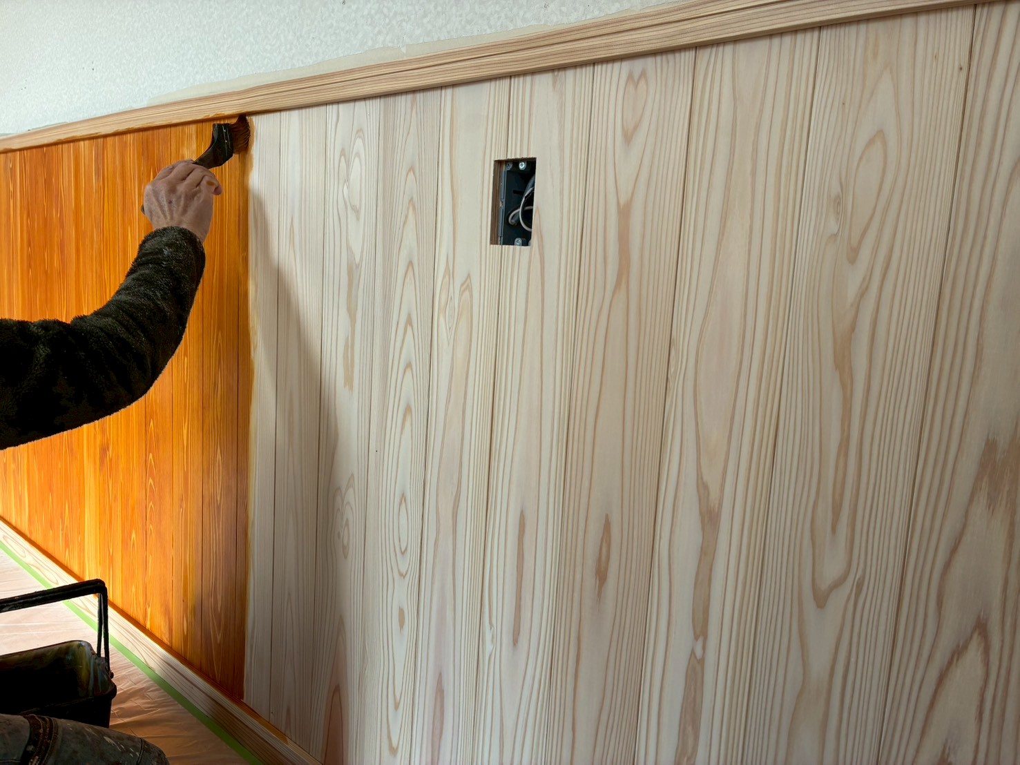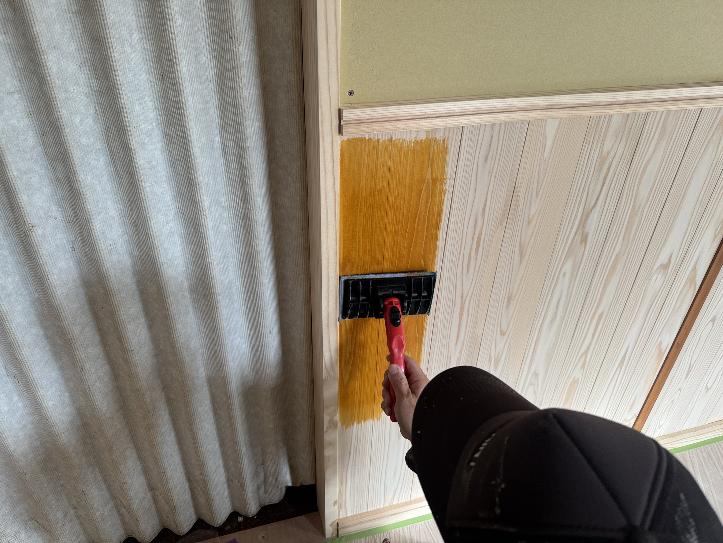 数年前迄は刷毛で色着けしウエスでふき取る作業で時間もかかっていましたがコテ刷毛の登場で随分スムーズに作業が出来るようになりました