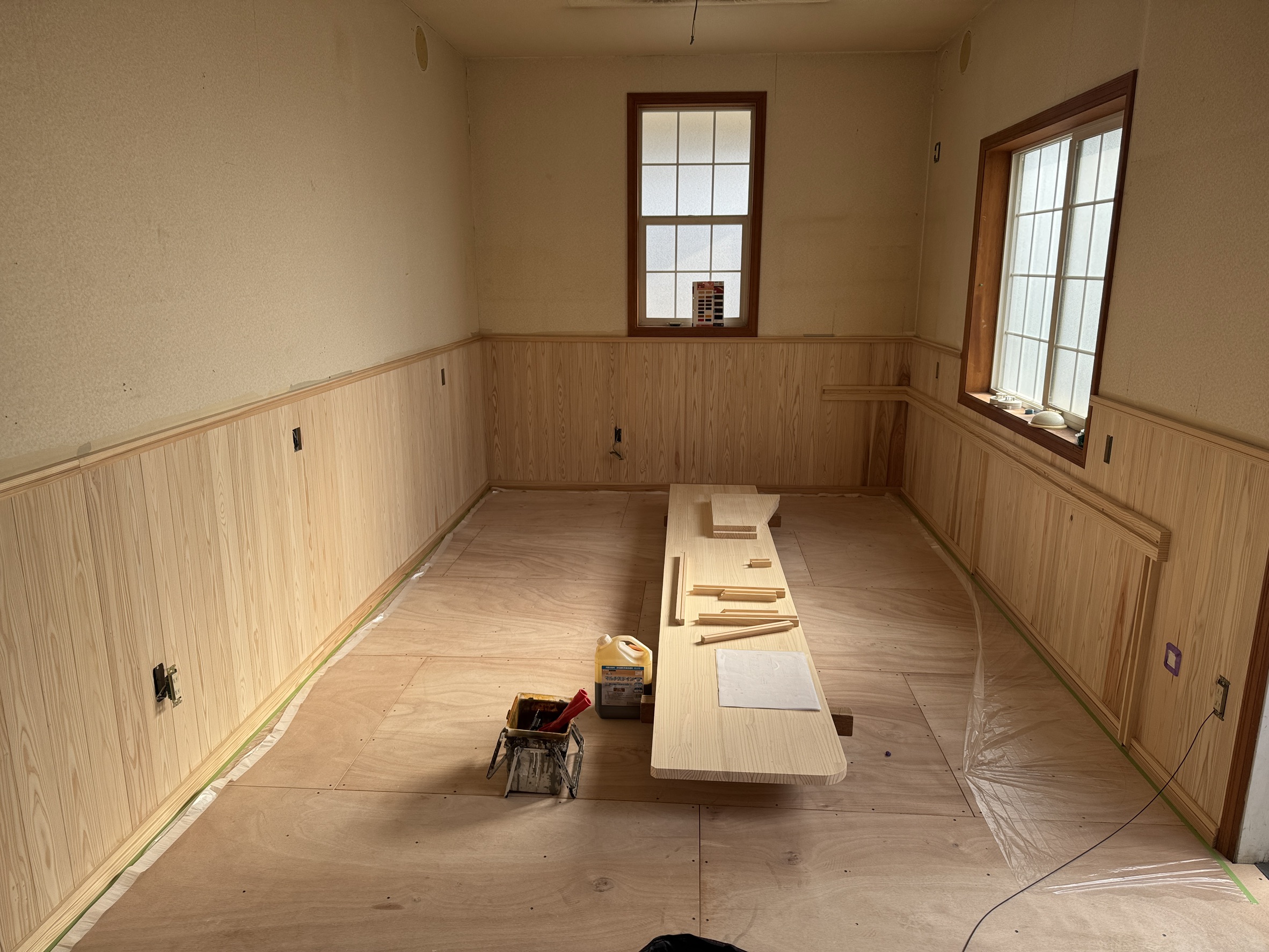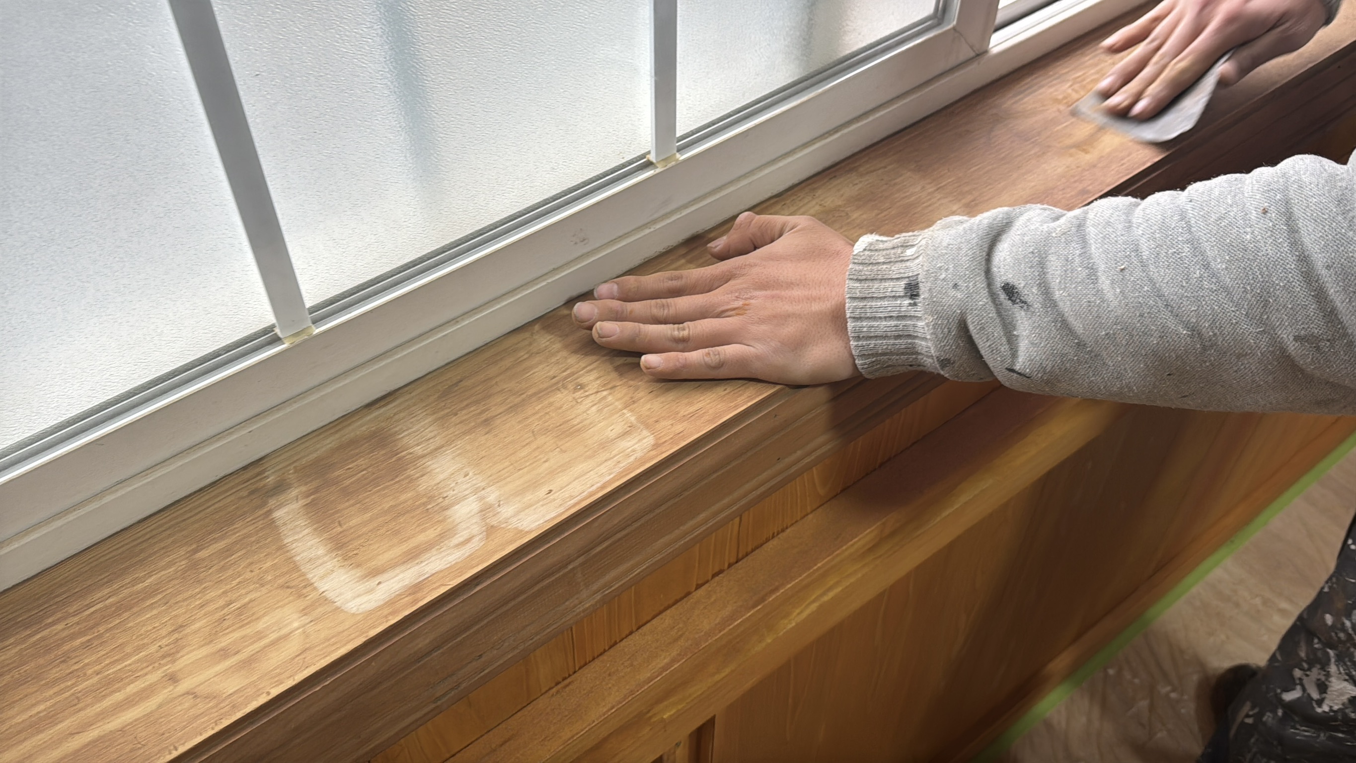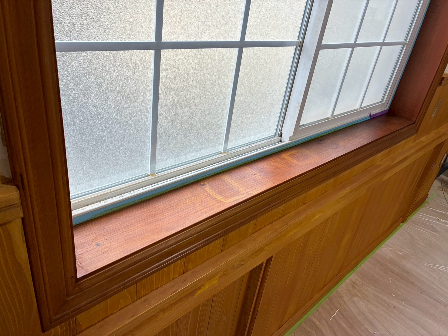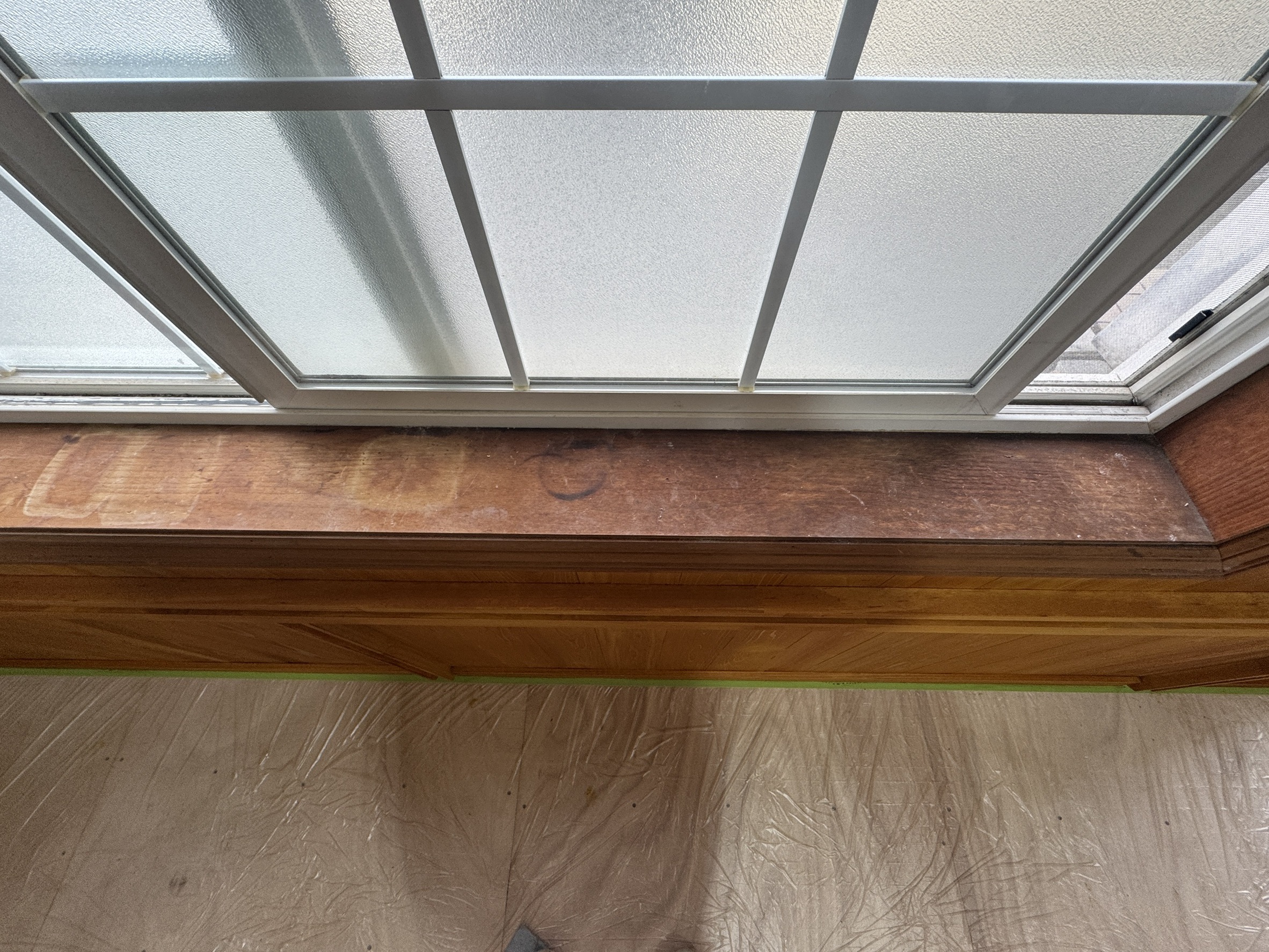 窓枠のしみが気になりペーパーかけし表面をげずっる作業です