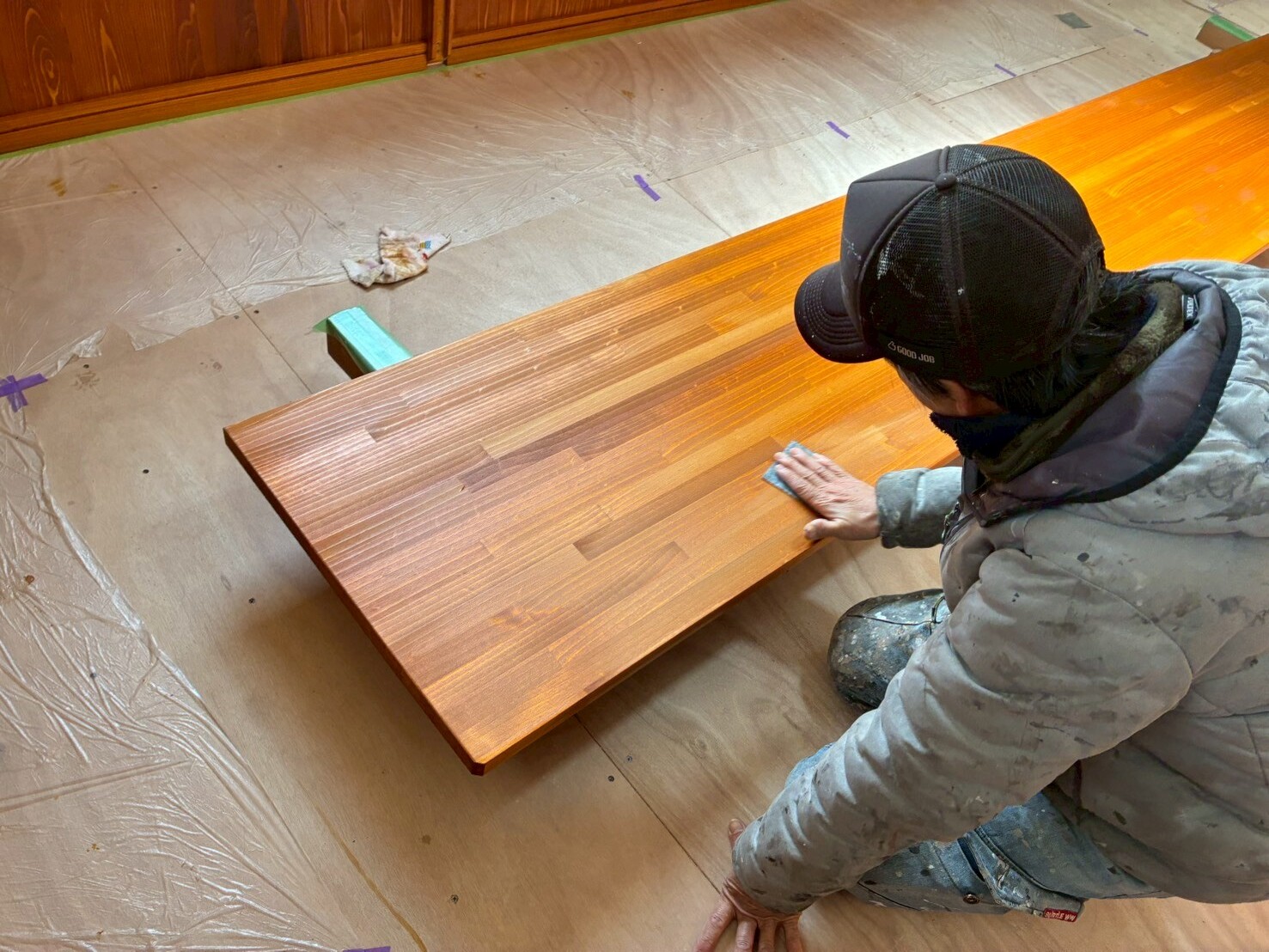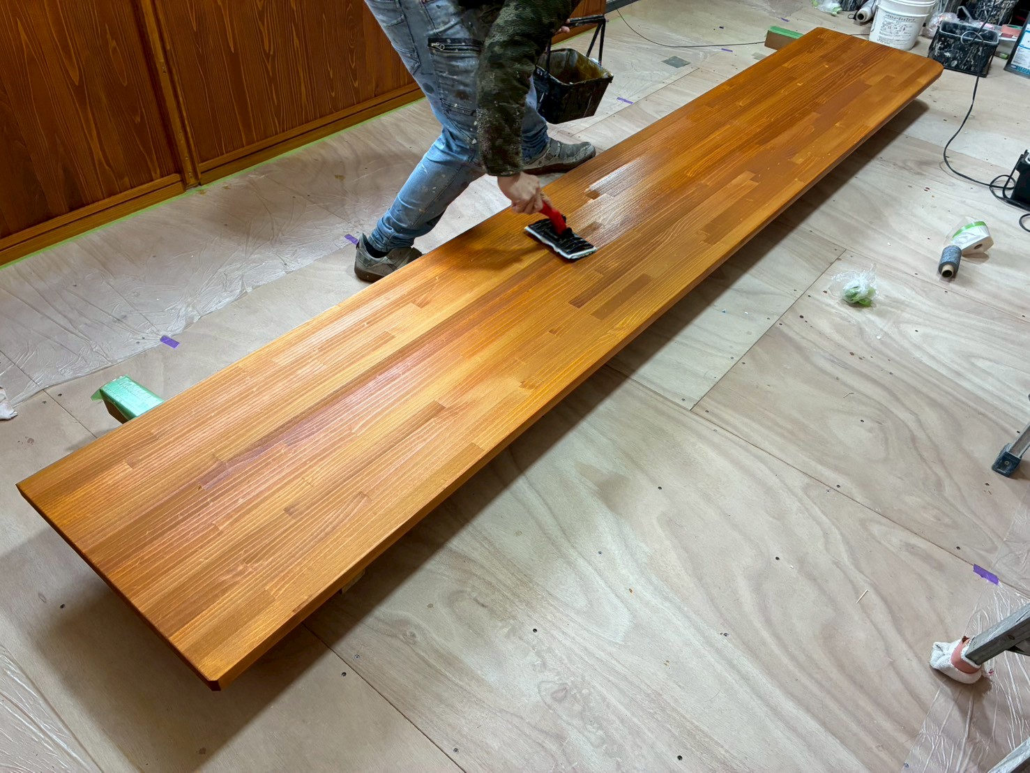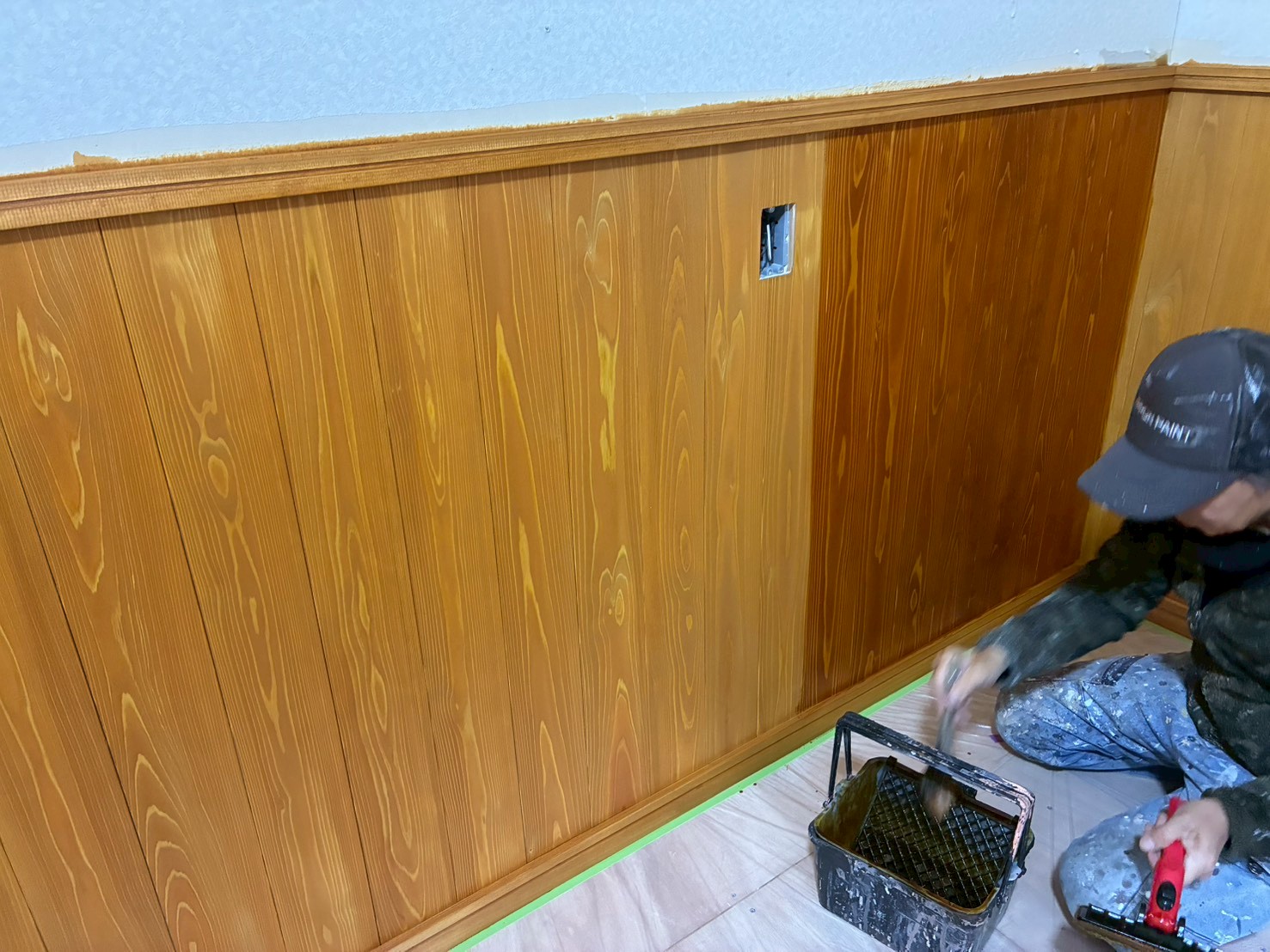 色着け作業が終わり、サンディングシーラーの施工です