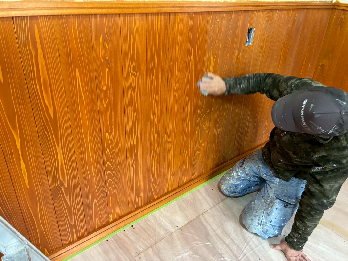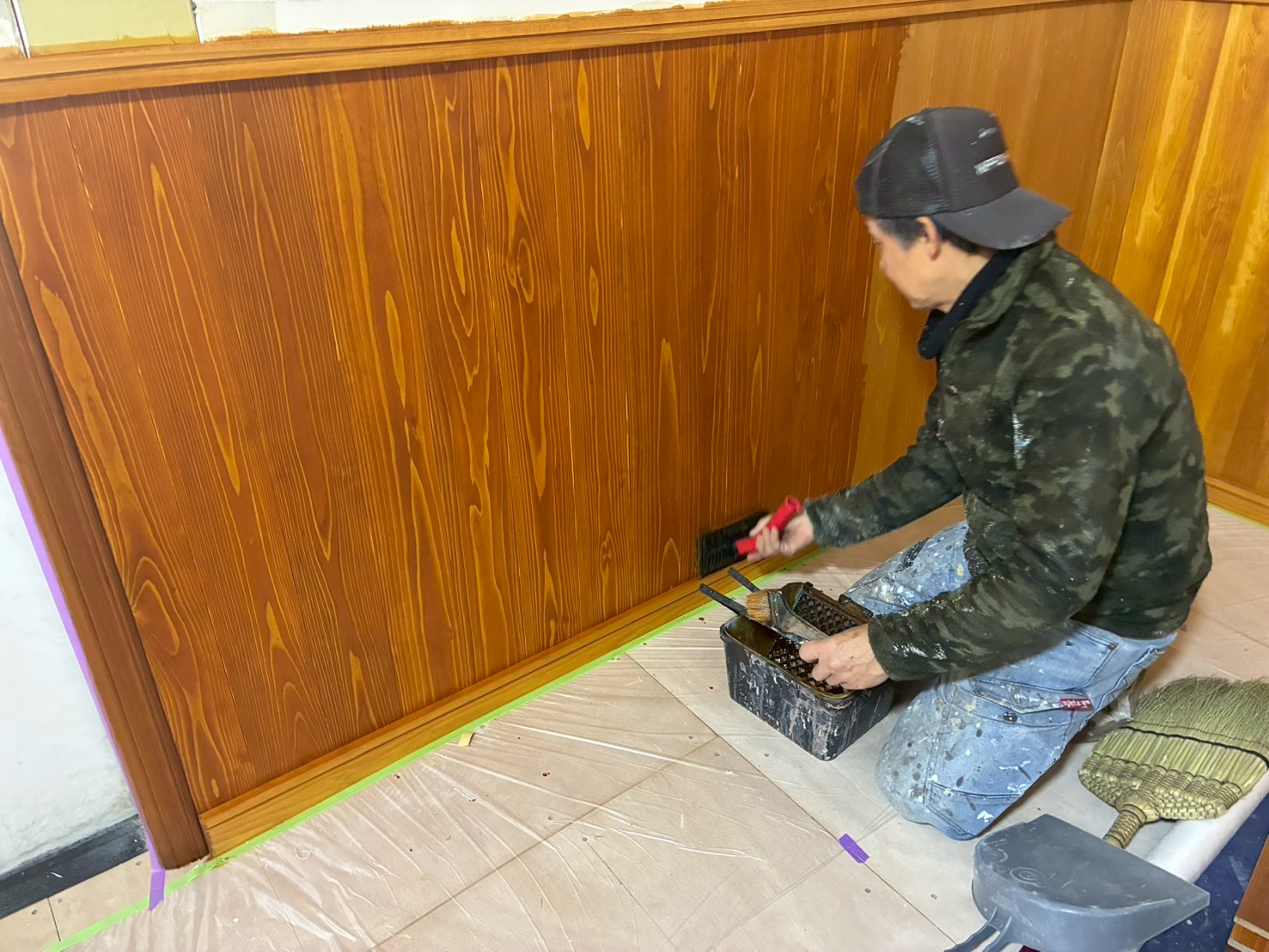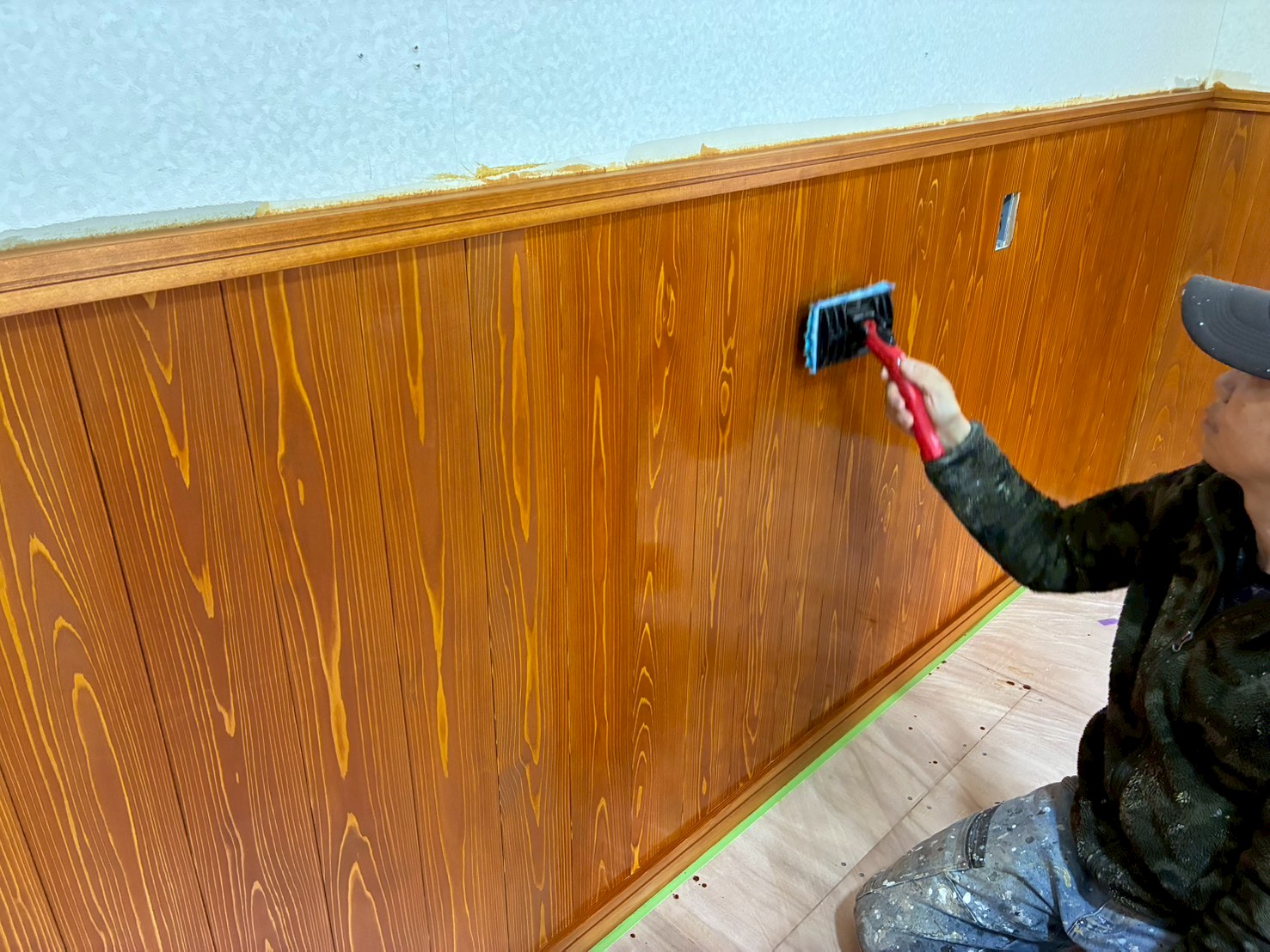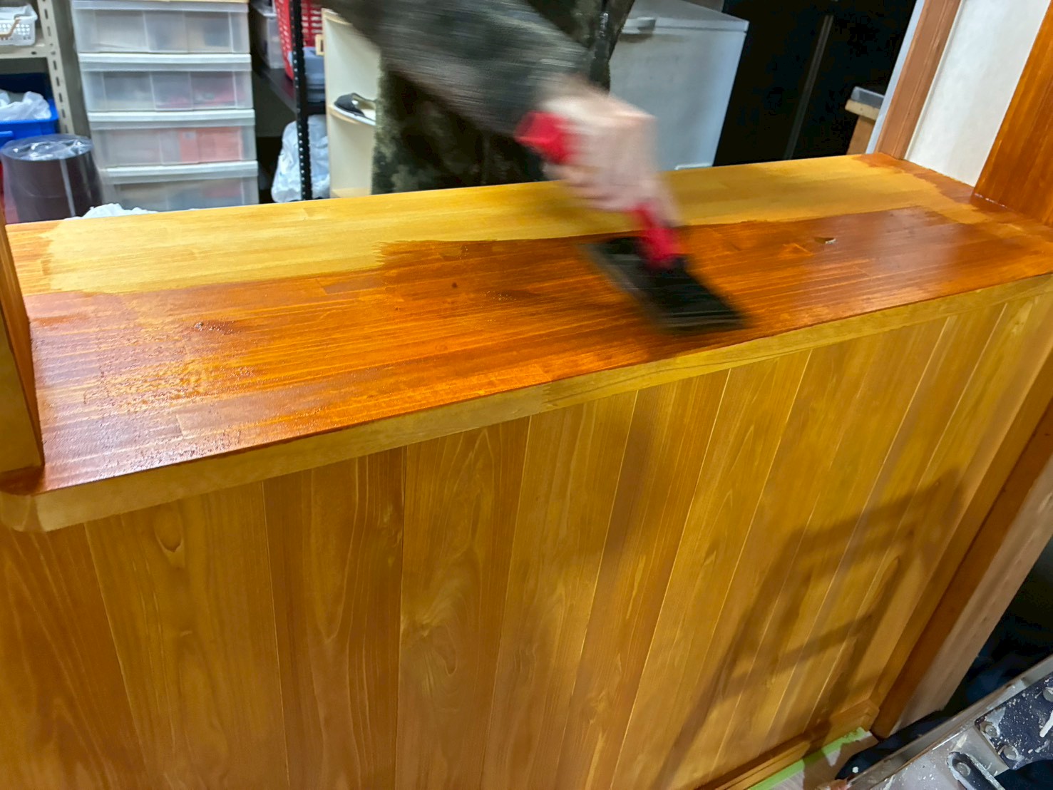 色着け作業が終わり、サンディングシーラーの施工です